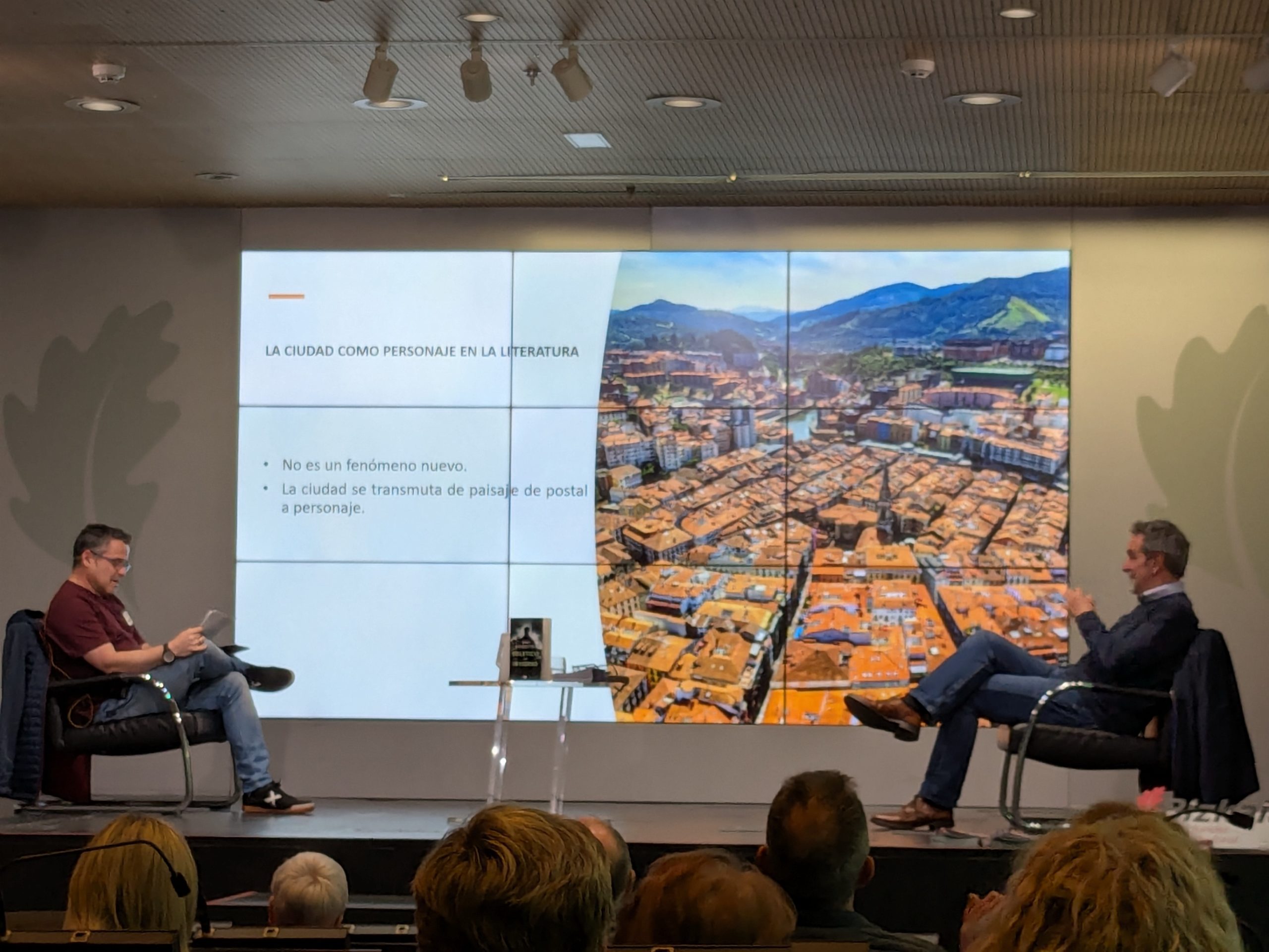 Tras una presentación sobre el rol y las capacidades de la ciudad en la literatura, Goikoetxea muestra cuatro localizaciones de sus libros, acompañadas por la lectura de algunos extractos en los que Bilbao toma protagonismo.